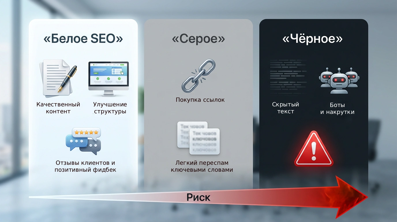 Современные алгоритмы быстро вычисляют манипуляции. Для коммерческих проектов по‑настоящему имеет смысл только белое SEO: оно даёт предсказуемый рост и не ставит под угрозу домен и бренд.