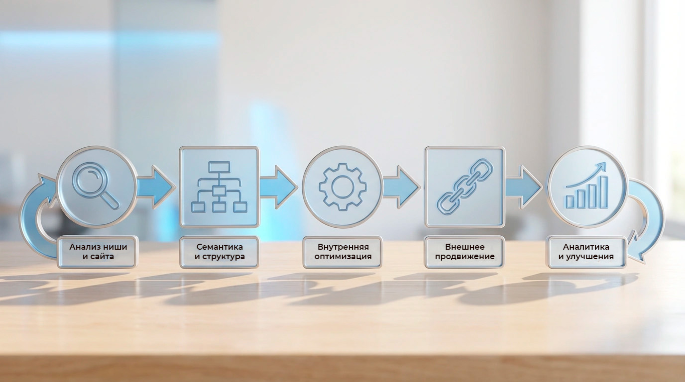 SEO идёт цепочкой шагов: от понимания рынка до постоянной доработки сайта. Каждый этап опирается на предыдущий, поэтому пропуски и хаотичные действия снижают результат.