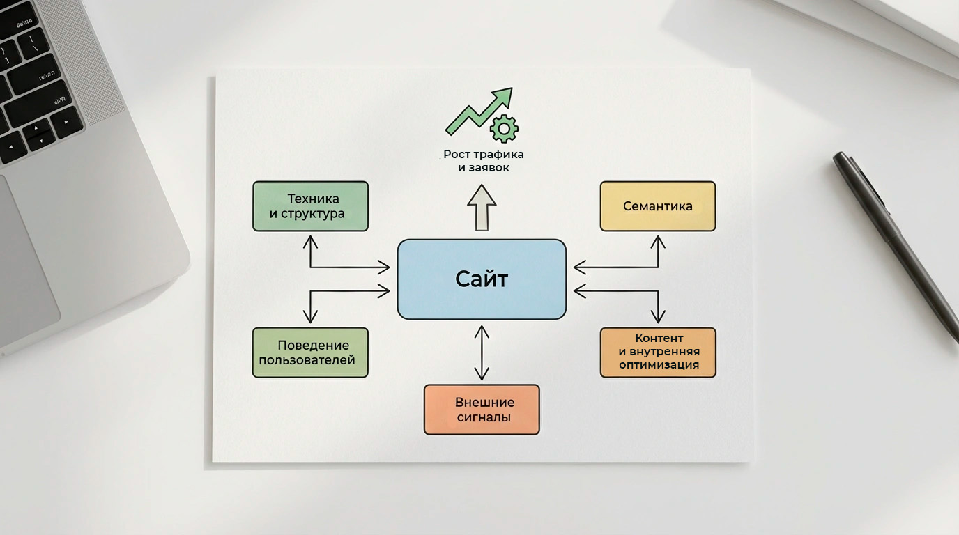 SEO держится на нескольких блоках, которые работают вместе: техническая часть, семантика и структура, контент и внутренняя оптимизация, внешние сигналы и поведение пользователей. Если выпадает один элемент, общий результат проседает.